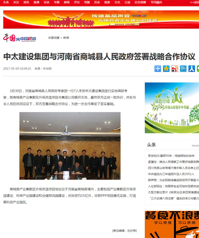 中國網(wǎng)報道了“中太建設(shè)集團(tuán)與河南省商城縣人民政府簽署戰(zhàn)略合作協(xié)議”