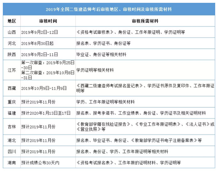 二建考試到現(xiàn)在已過了五月,大部分省市都已公布成績及合格標(biāo)準(zhǔn)。2019年有不少省市二建是有要求考后審核的。除了江西,其他地方怎么規(guī)定呢?以下是整理的二級建造師考后審核的地區(qū)及資料,供大家參考,希望對考生們有所幫助!(詳細(xì)信息以官方文件為主)