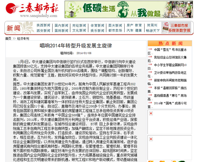 三秦都市報(bào)報(bào)道了中太建設(shè)集團(tuán)唱響2014年轉(zhuǎn)型升級(jí)發(fā)展主旋律